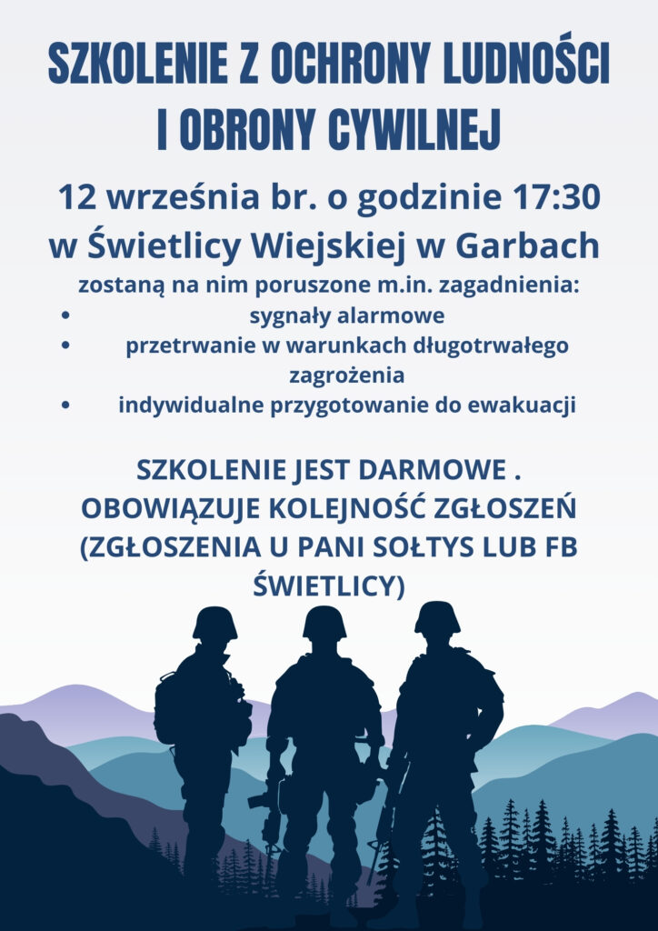 Sołectwo Garby wraz ze współpracy z Gminą Swarzędz zaprasza Państwa na cykl szkoleń dla mieszkańców z zakresu ochrony ludności i obrony cywilnej.