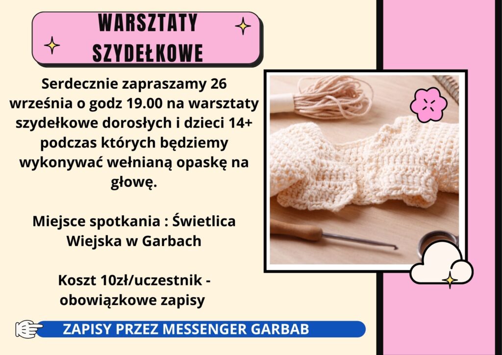 👉 Już 26 września o godz. 19:00 w Świetlicy Wiejskiej w Garbach spotykamy się na warsztatach szydełkowych dla dorosłych i młodzieży 14+.